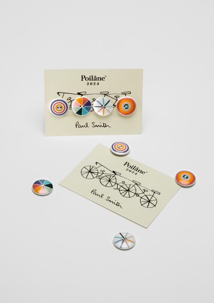 The charms-buttons are particularly impactful for this collaboration; indeed, this format not only connects with the world of couture that the designer represents but also highlights the shared passion of Apollonia Poilâne and Paul Smith for cycling. These charms go beyond their decorative aspect. They can be used as real buttons to personalize your favorite jacket. Whether for a subtle touch of originality or to proudly display your love for fashion and cycling, these bean-buttons are versatile accessories that allow you to create a unique and bold style.